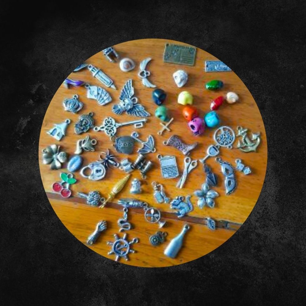 - des breloques (ou charms en anglais) que j’ai récoltés petit à petit selon mes besoins de représentation, symbolique et image.
